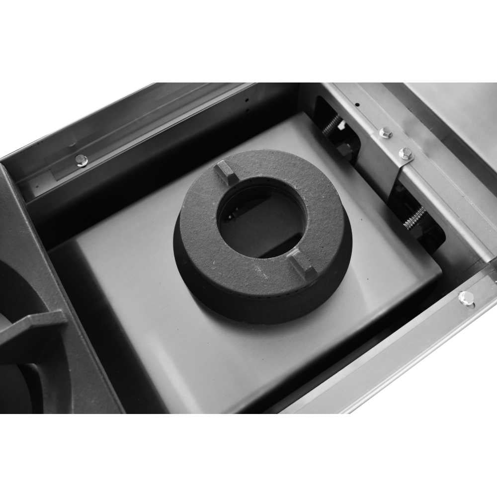 Operated by independent controls, the cooktop has cast-iron trivets and heavy-duty burners with a stable flame, a standby pilot and a flame failure safety valve. Compatible with either natural gas or LPG with the conversion kit provided in the packaging.