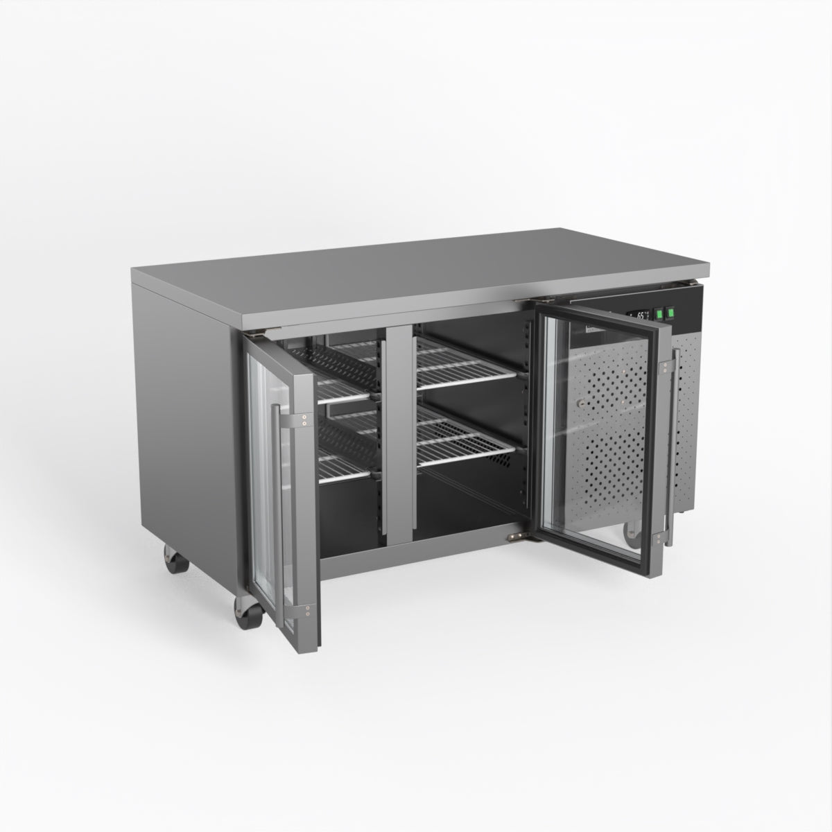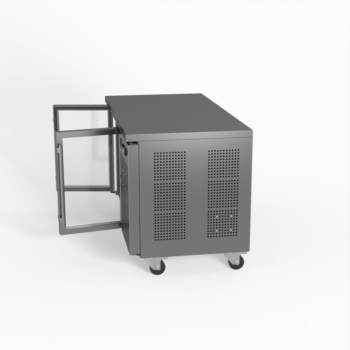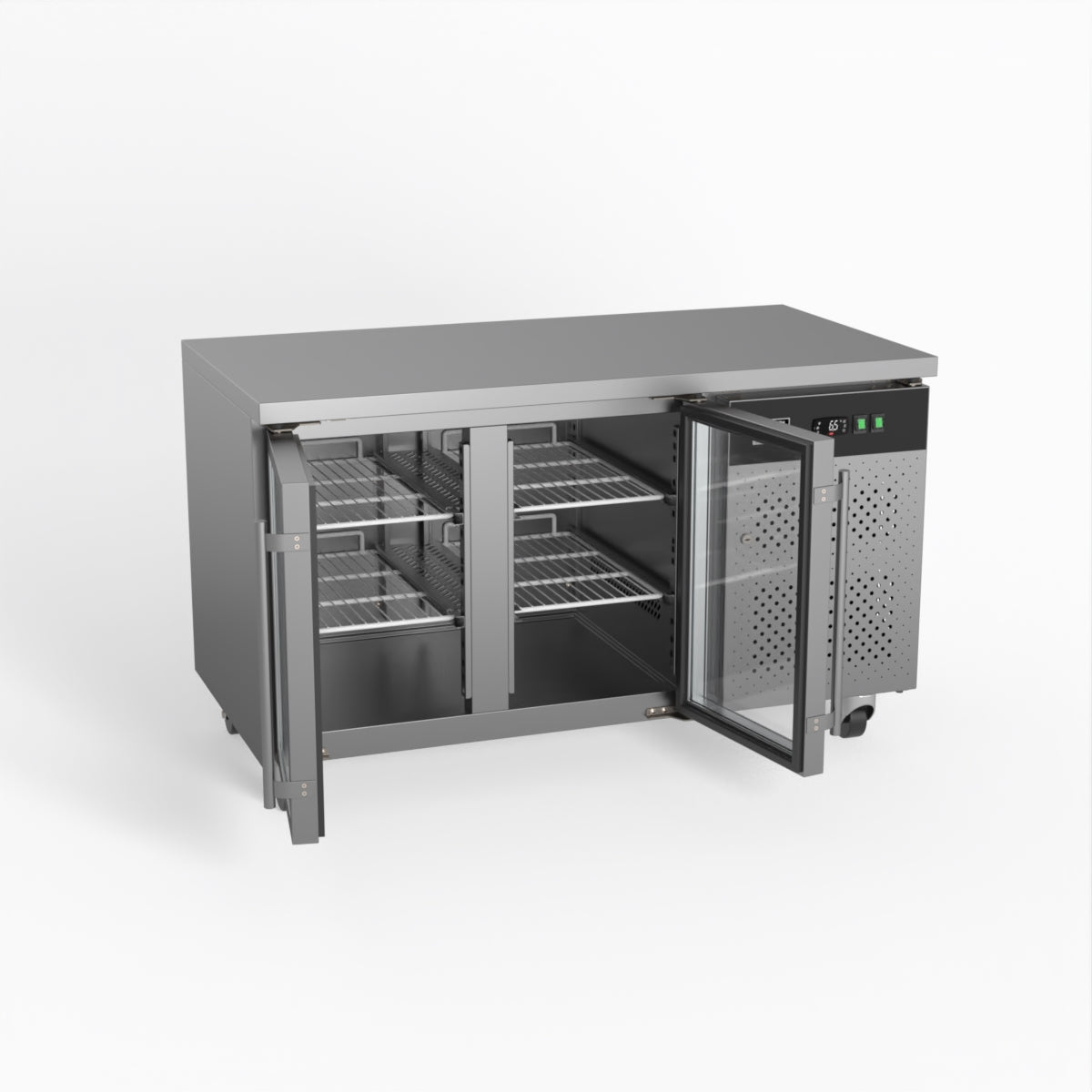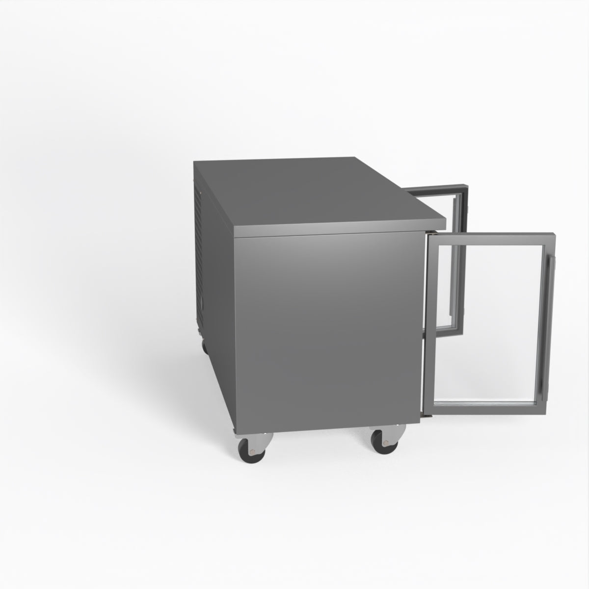 This fridge is made of sturdy stainless steel and can manage ambient temperatures of up to 43°C. Ideal for restaurants, cafes, and bars, the self-closing glass doors and modern Carel iJF electronic controls enable accurate temperature regulation even in high-pressure conditions. This unit, with fan-forced ventilated cooling and double-glazed glass doors with GN1/1-sized shelves, can hold up to four complete Gastronome 1/1 trays or pans. Improve your kitchen's efficiency instantly!