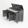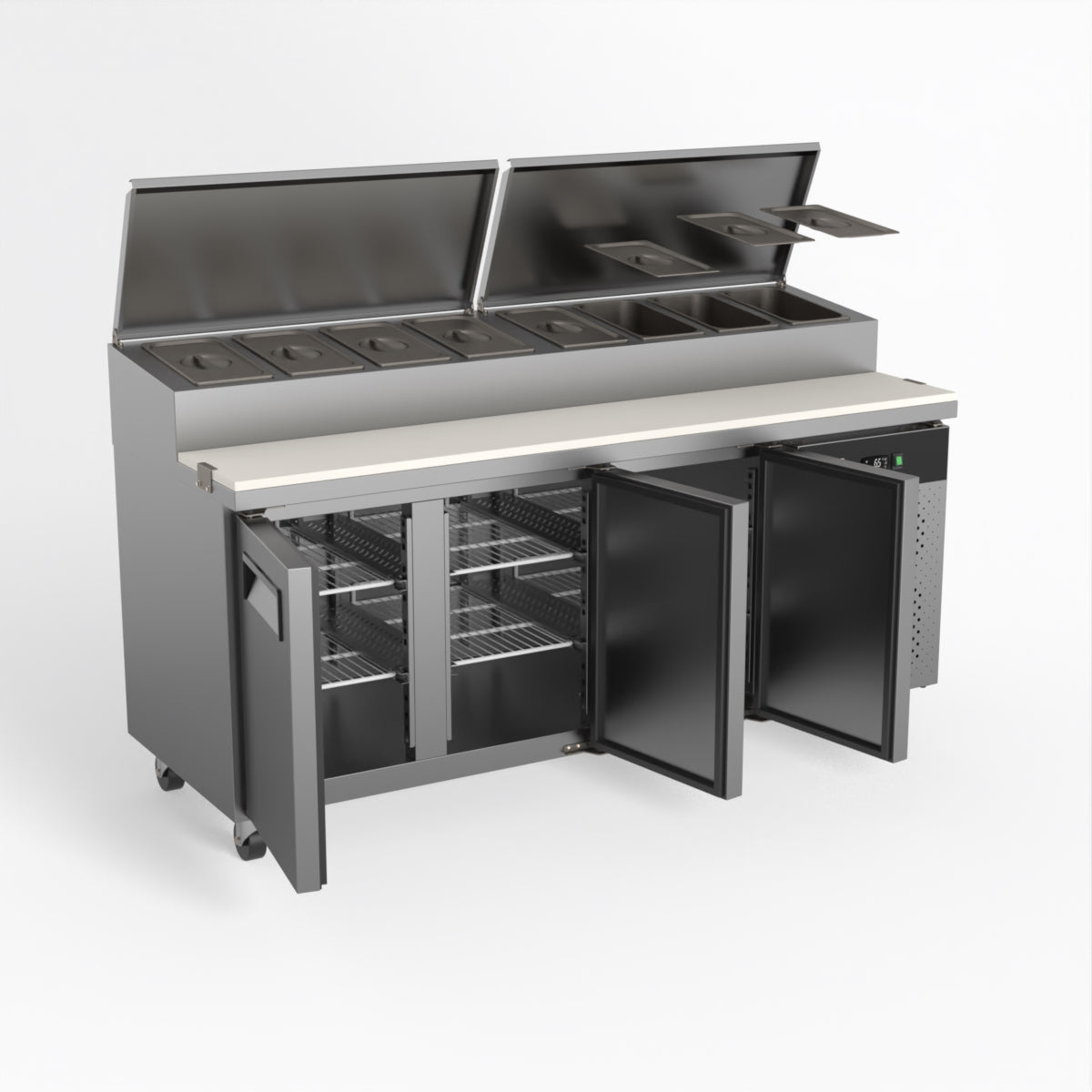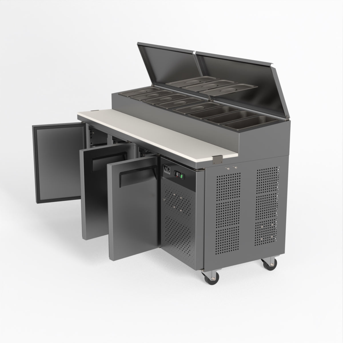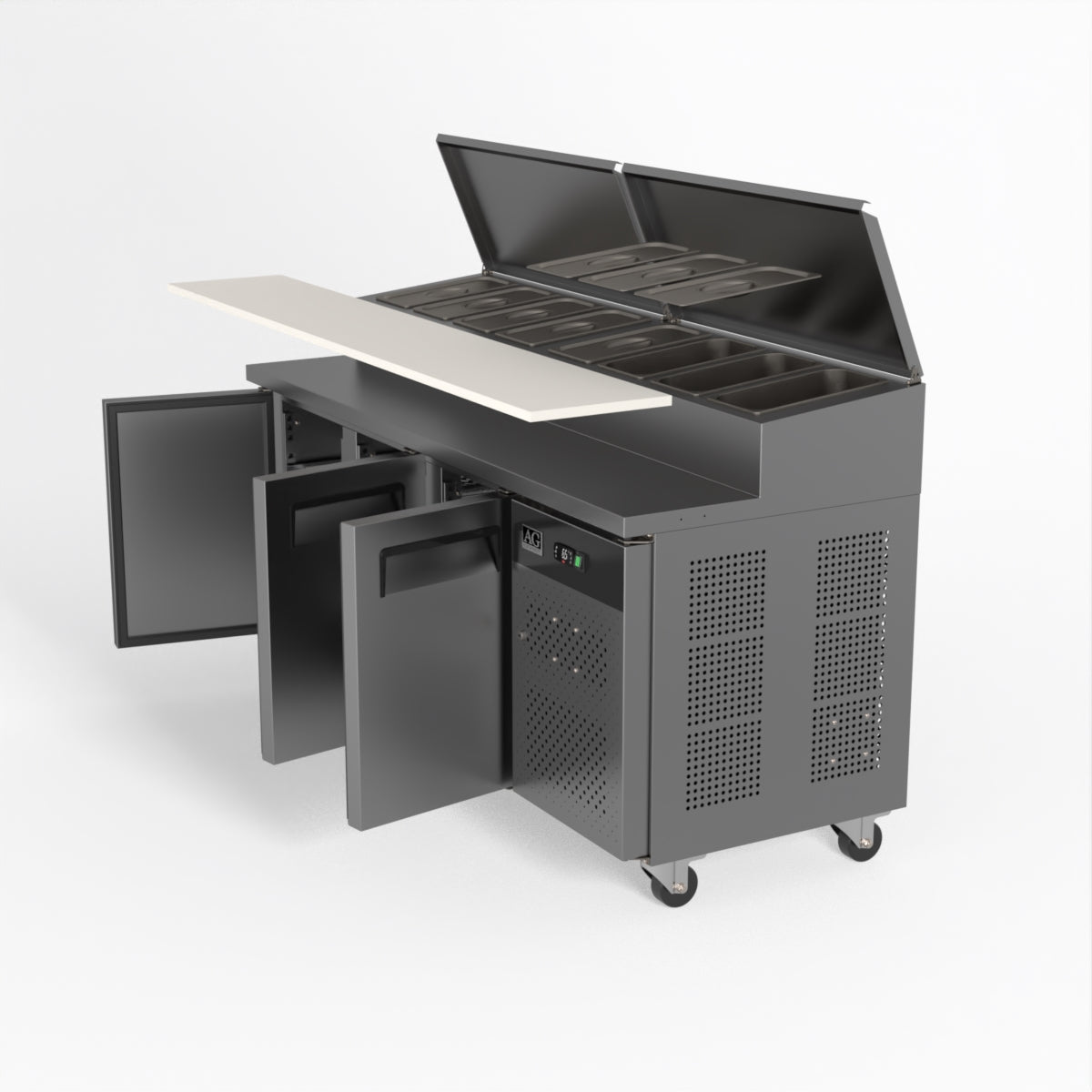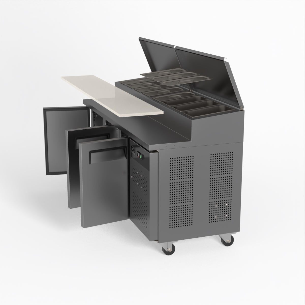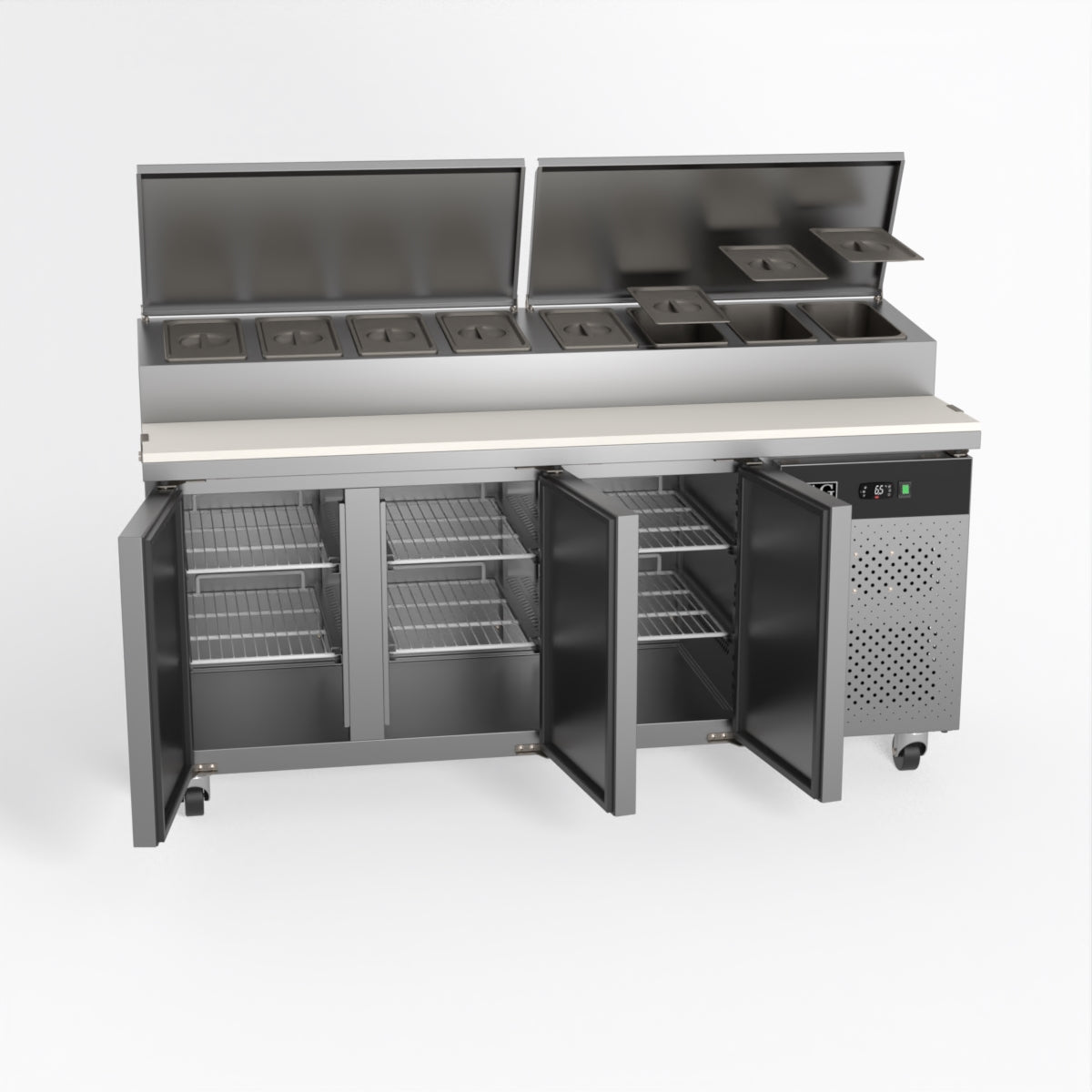 Equipped with castor wheels for easy manoeuvrability and constructed from heavy-duty stainless steel, the saladette worktop fridge is designed for busy commercial environments such as cafes, restaurants, pubs, and sandwich shops. With a 30cm deep preparation bench, self-closing doors on the fridge storage space and shelving rails suitable for 1/1 GN and 1/3 GN trays, this unit is designed to keep food products fresh and accessible during the meal-time rush. This unit is built with a Cubigel compressor and an automated defrosting system, complemented by Carel iJF digital controller with LED temperature displays.