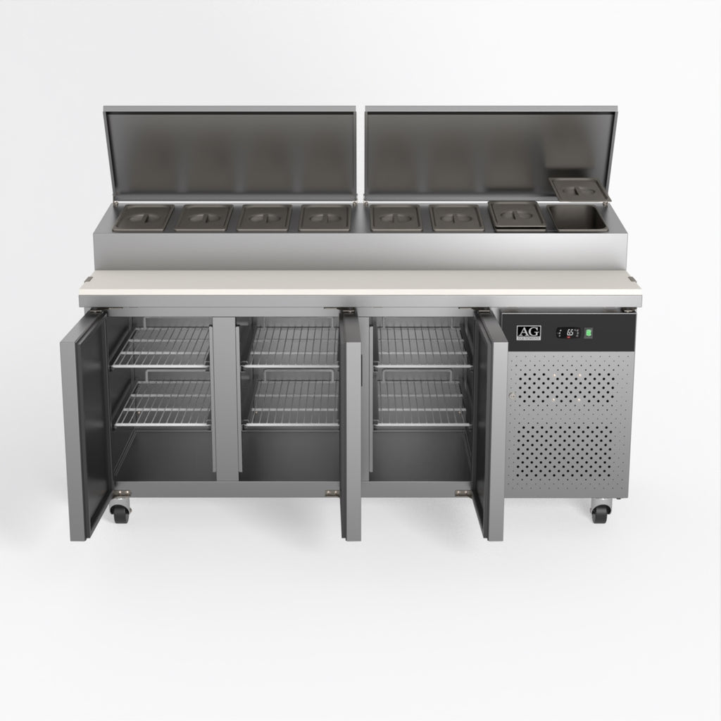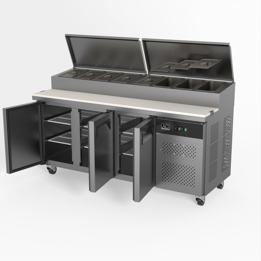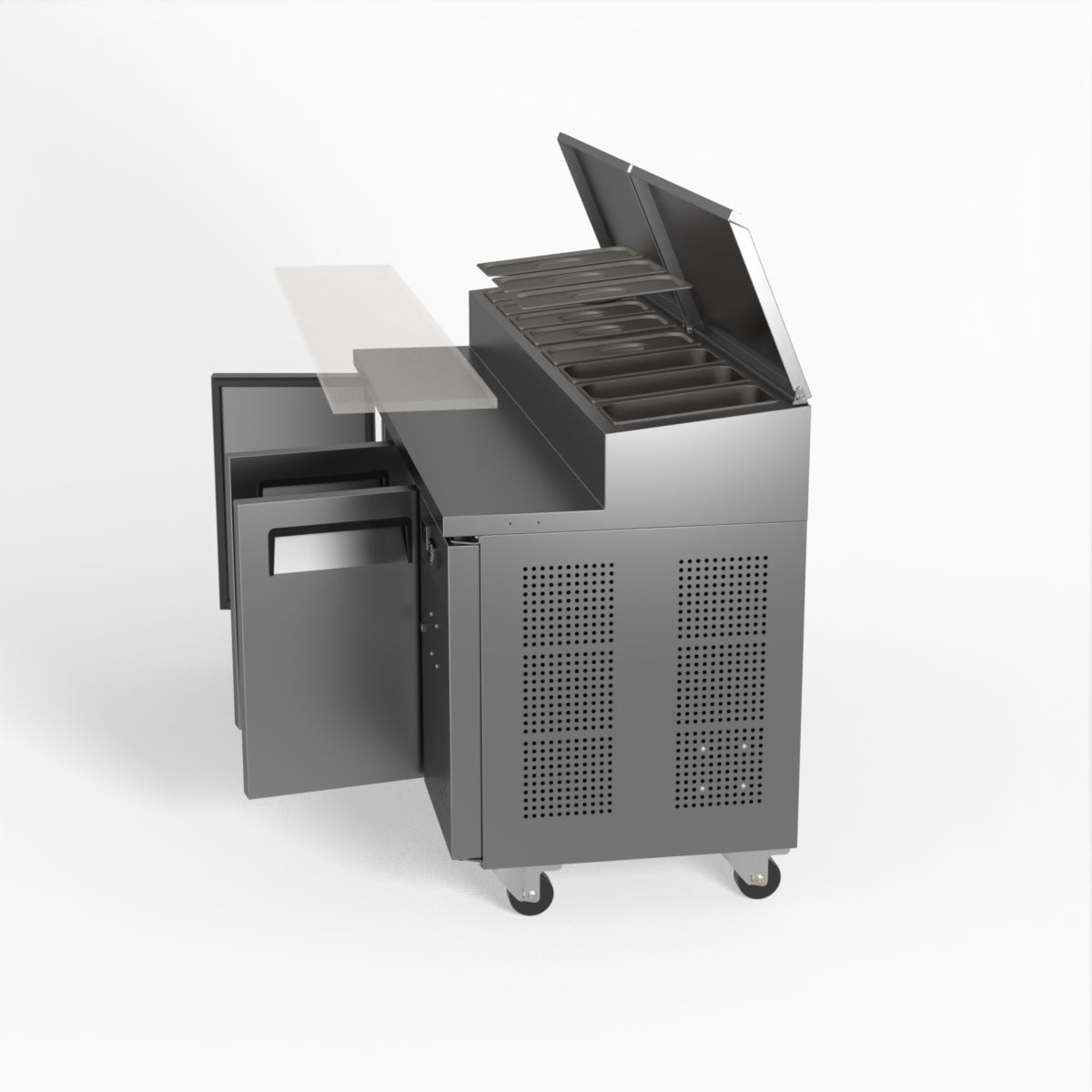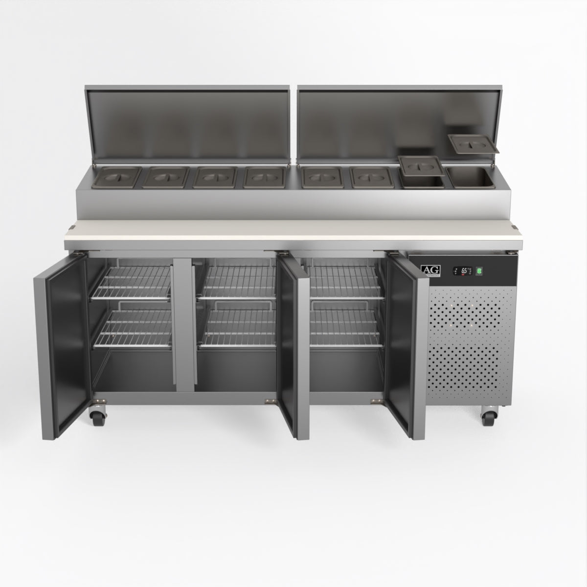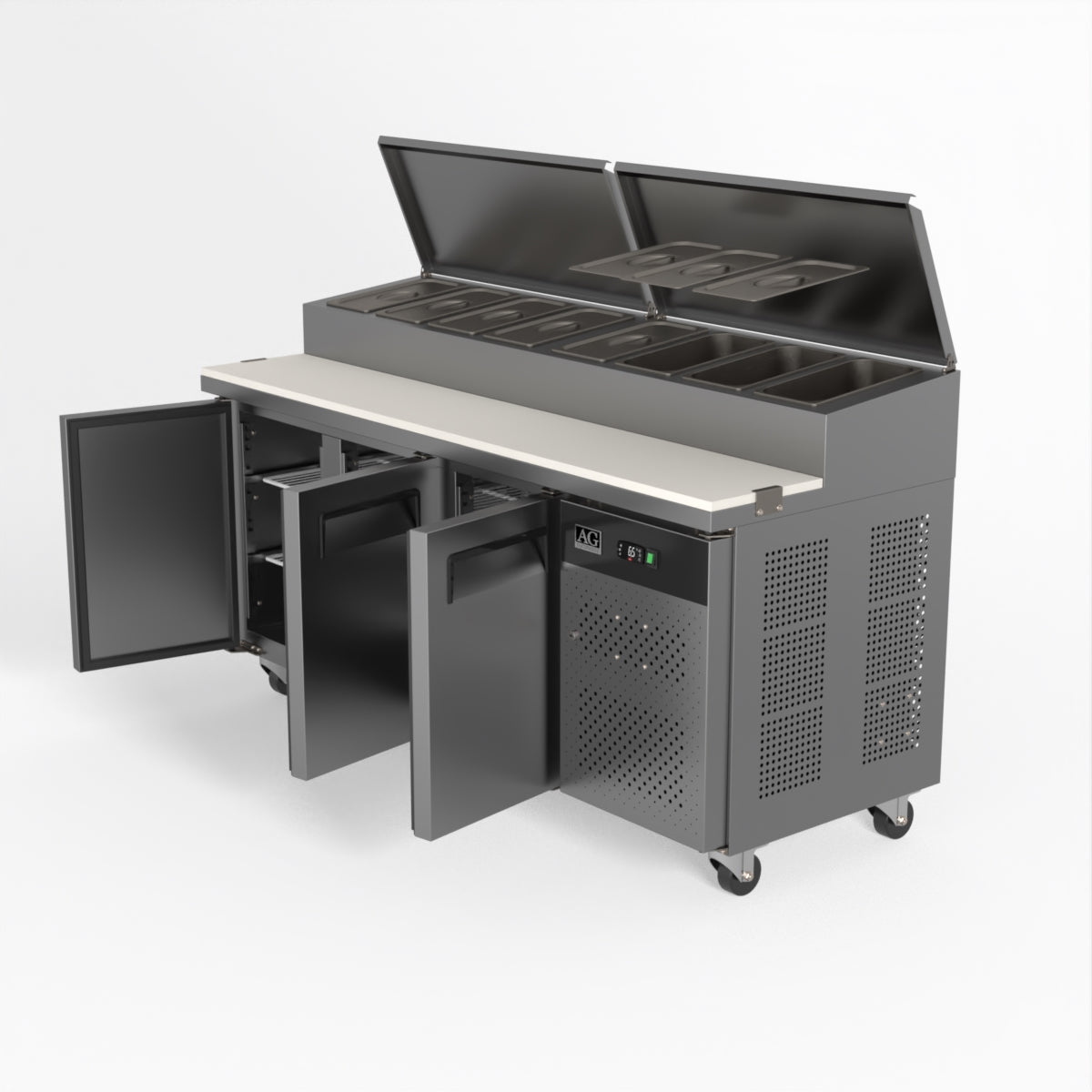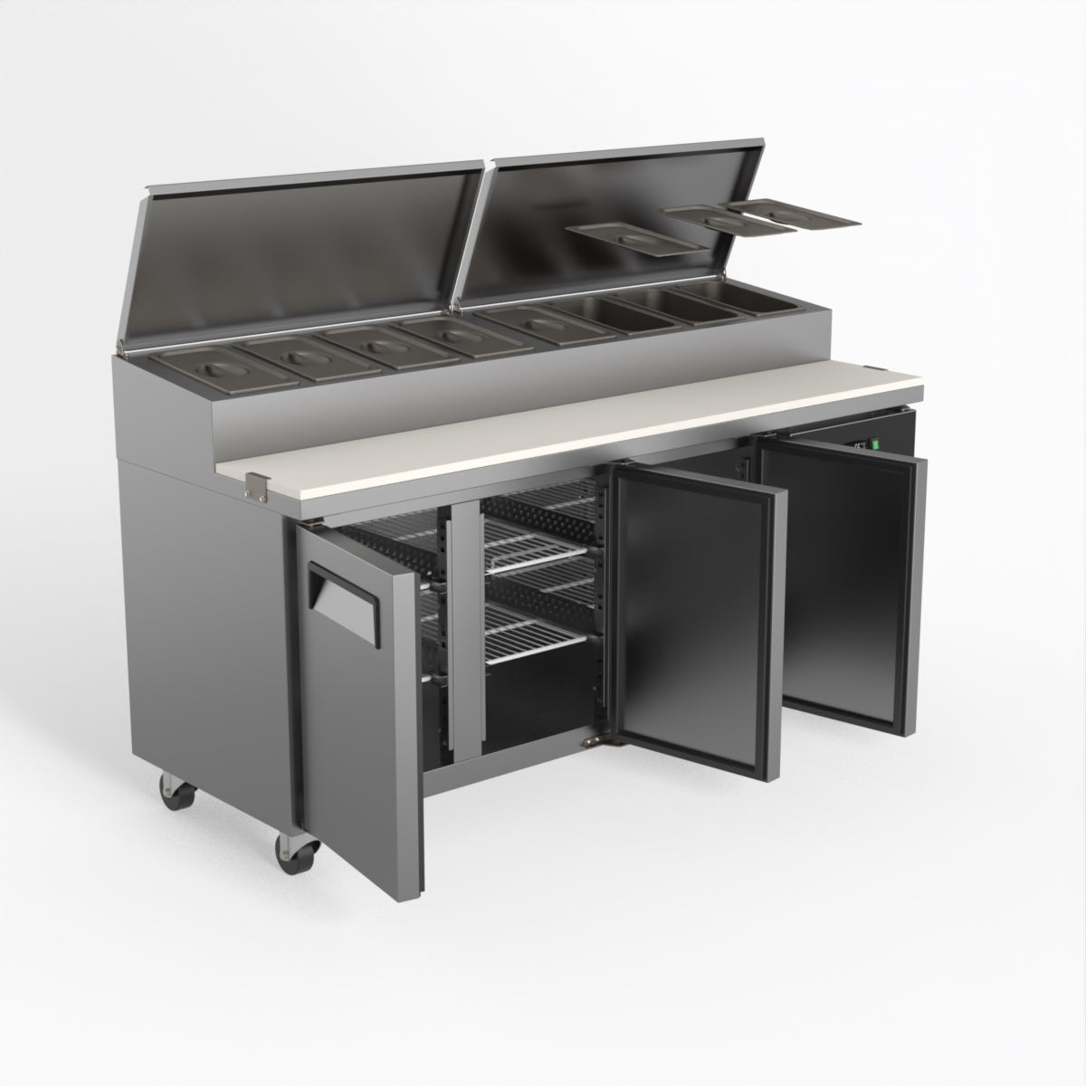 Equipped with castor wheels for easy manoeuvrability and constructed from heavy-duty stainless steel, the saladette worktop fridge is designed for busy commercial environments such as cafes, restaurants, pubs, and sandwich shops. With a 30cm deep preparation bench, self-closing doors on the fridge storage space and shelving rails suitable for 1/1 GN and 1/3 GN trays, this unit is designed to keep food products fresh and accessible during the meal-time rush. This unit is built with a Cubigel compressor and an automated defrosting system, complemented by Carel iJF digital controller with LED temperature displays.