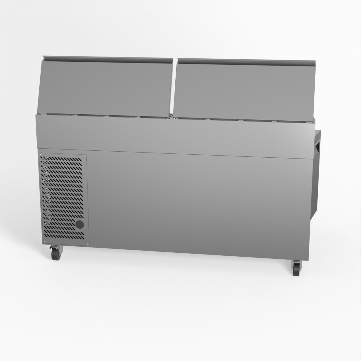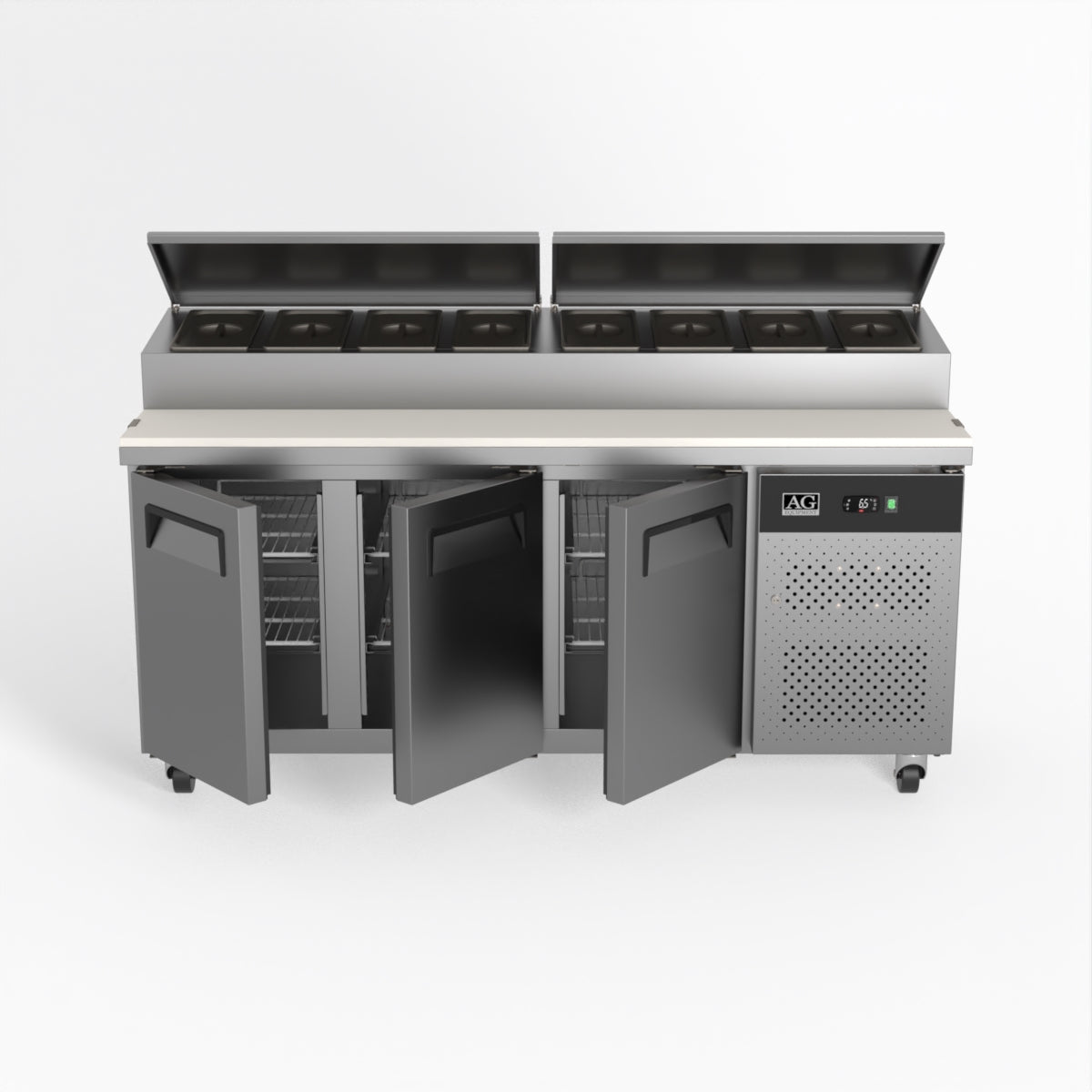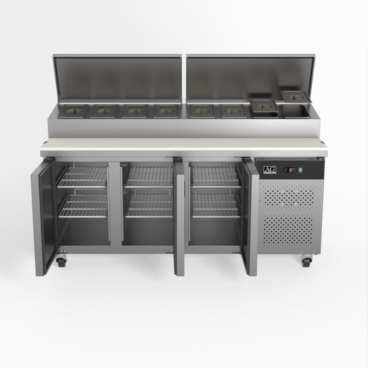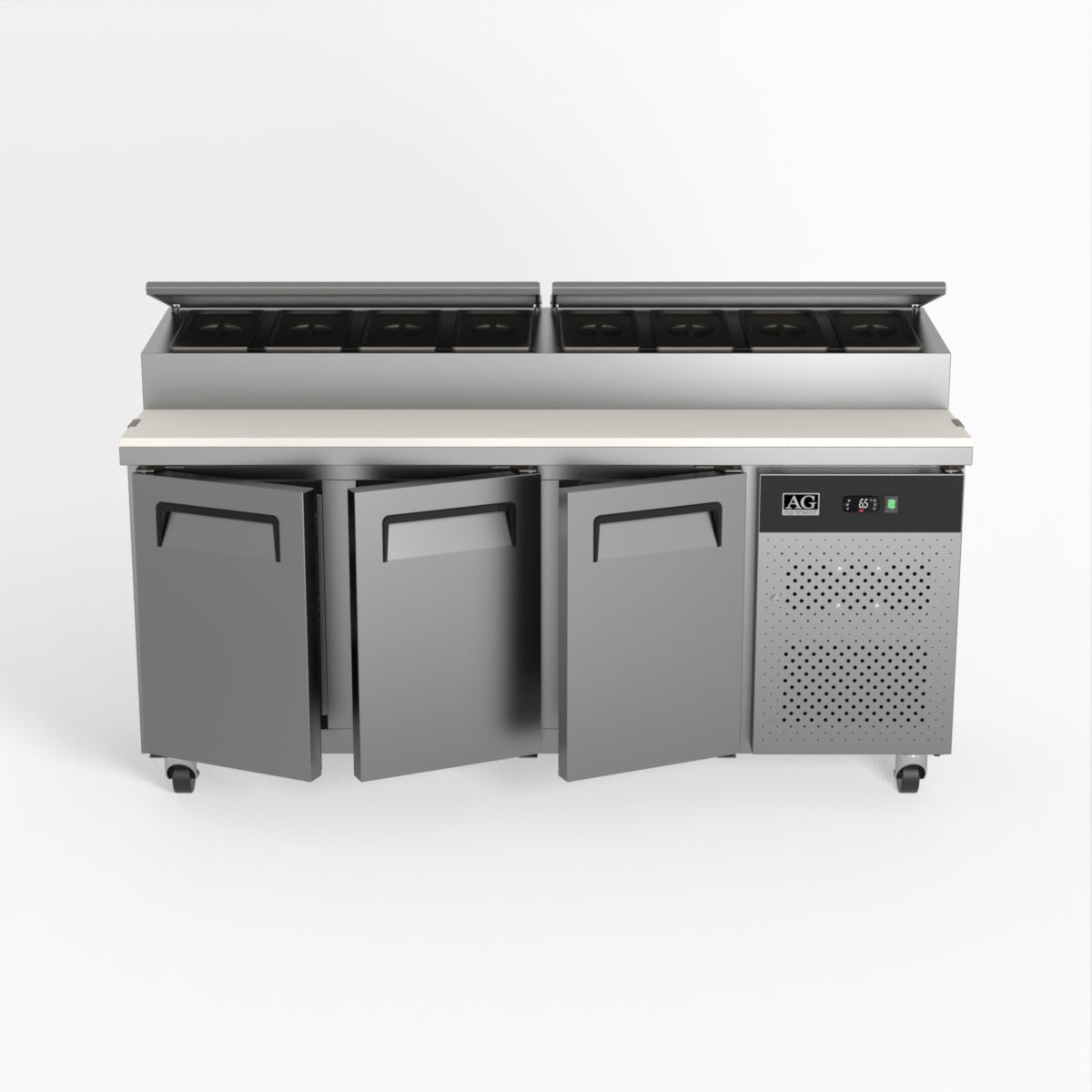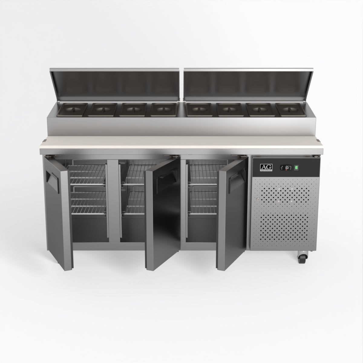 Equipped with castor wheels for easy manoeuvrability and constructed from heavy-duty stainless steel, the saladette worktop fridge is designed for busy commercial environments such as cafes, restaurants, pubs, and sandwich shops. With a 30cm deep preparation bench, self-closing doors on the fridge storage space and shelving rails suitable for 1/1 GN and 1/3 GN trays, this unit is designed to keep food products fresh and accessible during the meal-time rush. This unit is built with a Cubigel compressor and an automated defrosting system, complemented by Carel iJF digital controller with LED temperature displays.