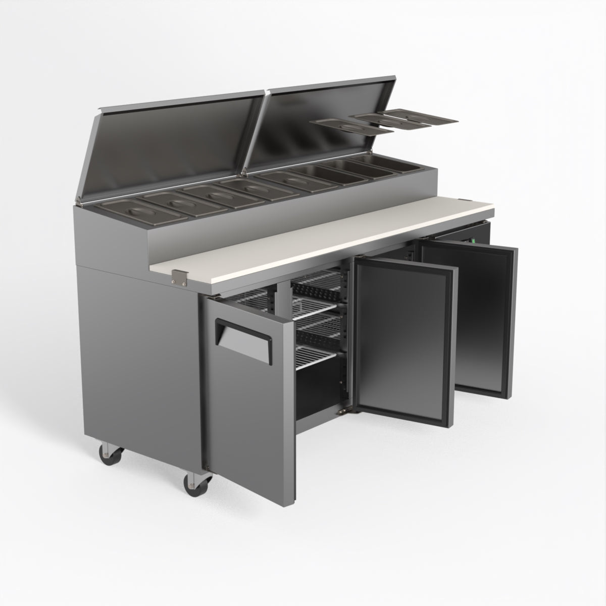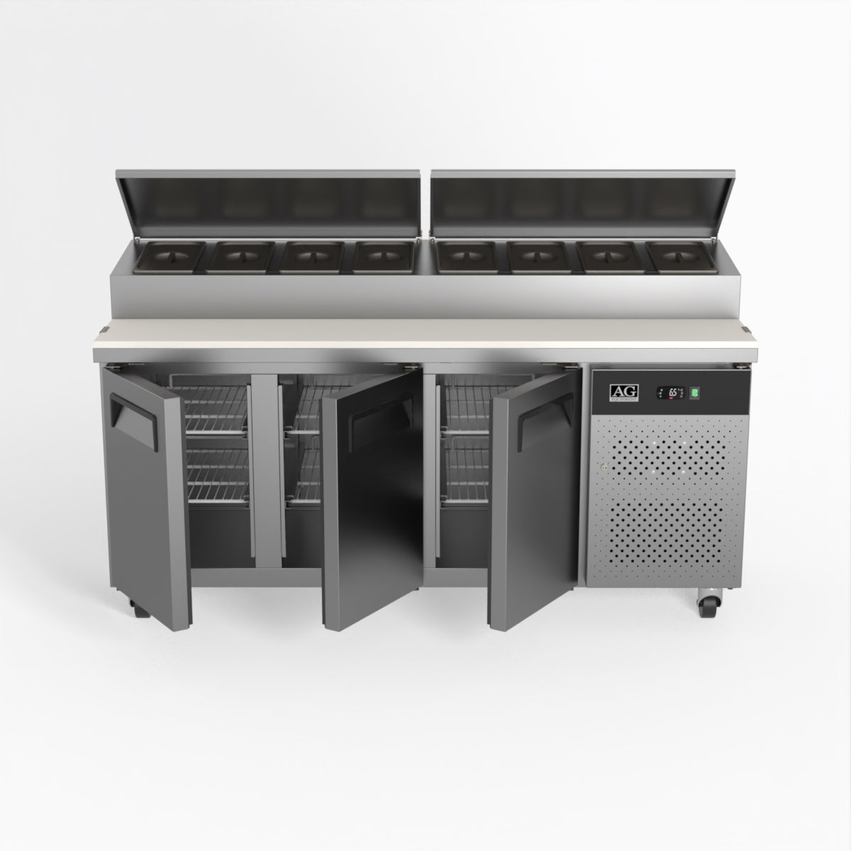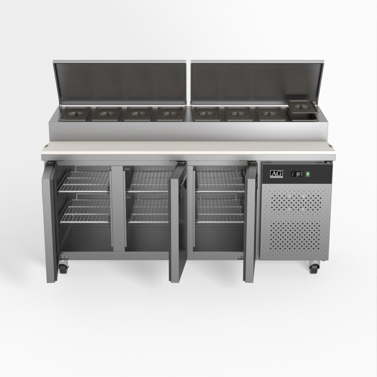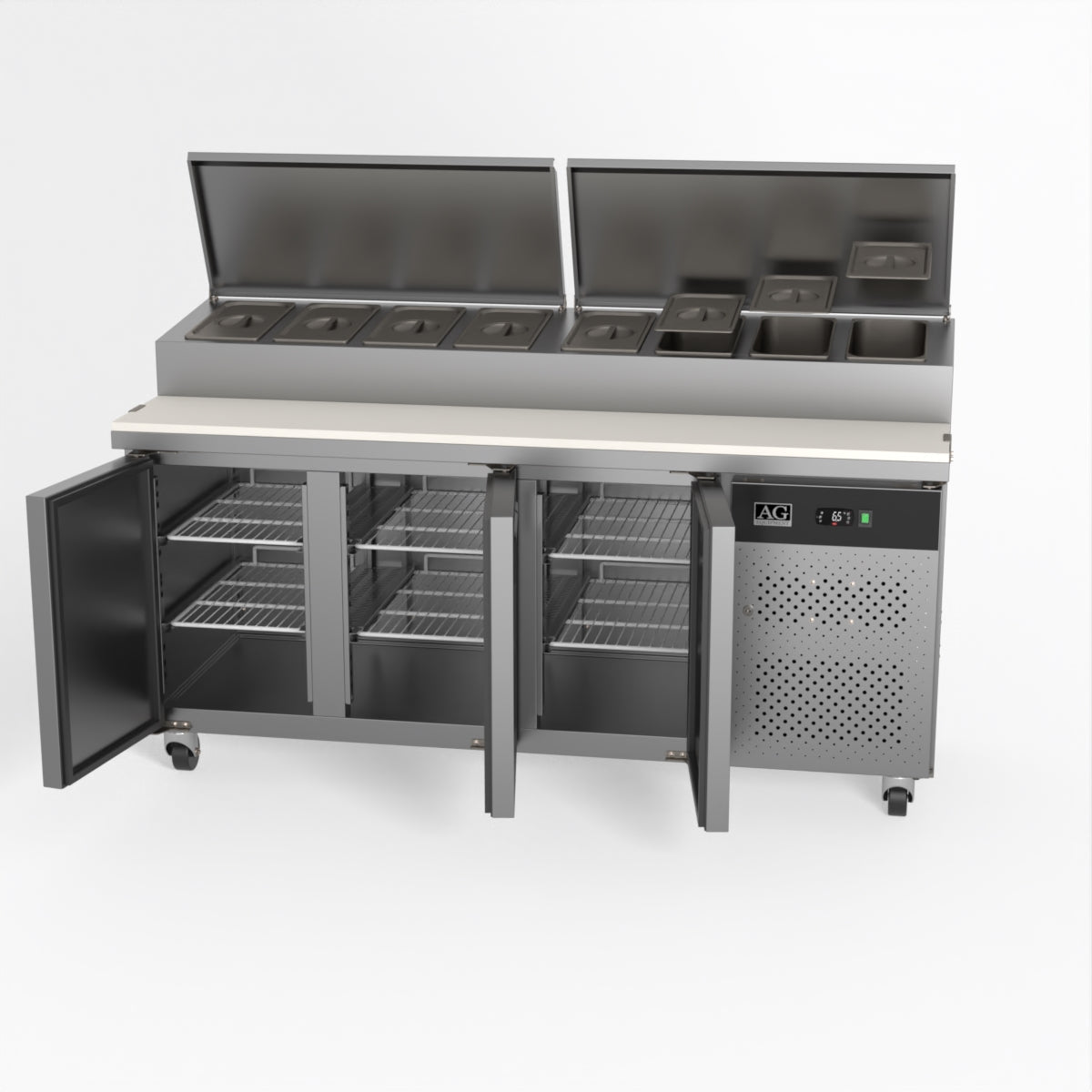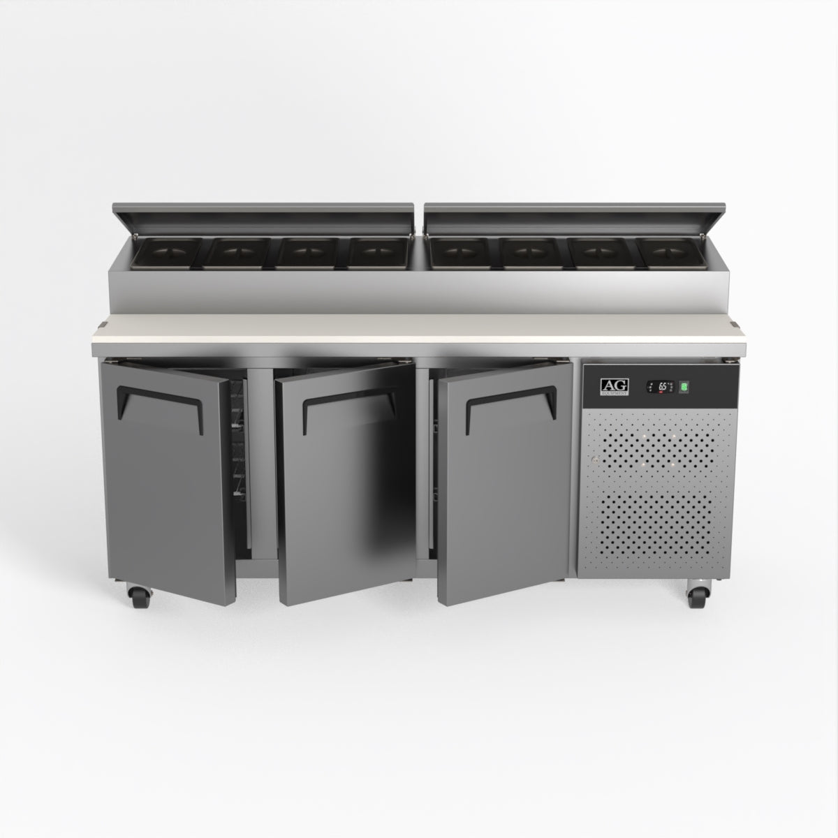 Equipped with castor wheels for easy manoeuvrability and constructed from heavy-duty stainless steel, the saladette worktop fridge is designed for busy commercial environments such as cafes, restaurants, pubs, and sandwich shops. With a 30cm deep preparation bench, self-closing doors on the fridge storage space and shelving rails suitable for 1/1 GN and 1/3 GN trays, this unit is designed to keep food products fresh and accessible during the meal-time rush. This unit is built with a Cubigel compressor and an automated defrosting system, complemented by Carel iJF digital controller with LED temperature displays.