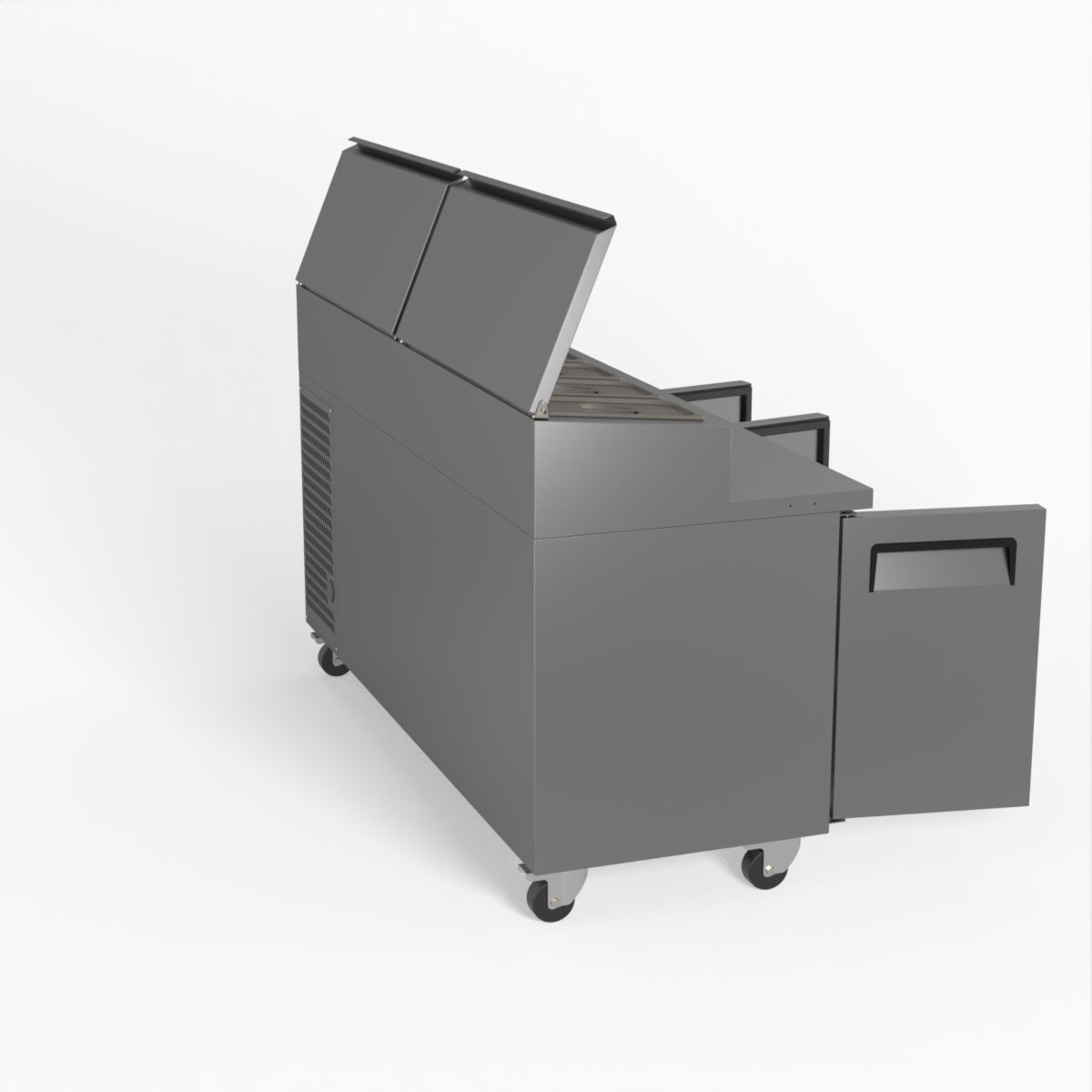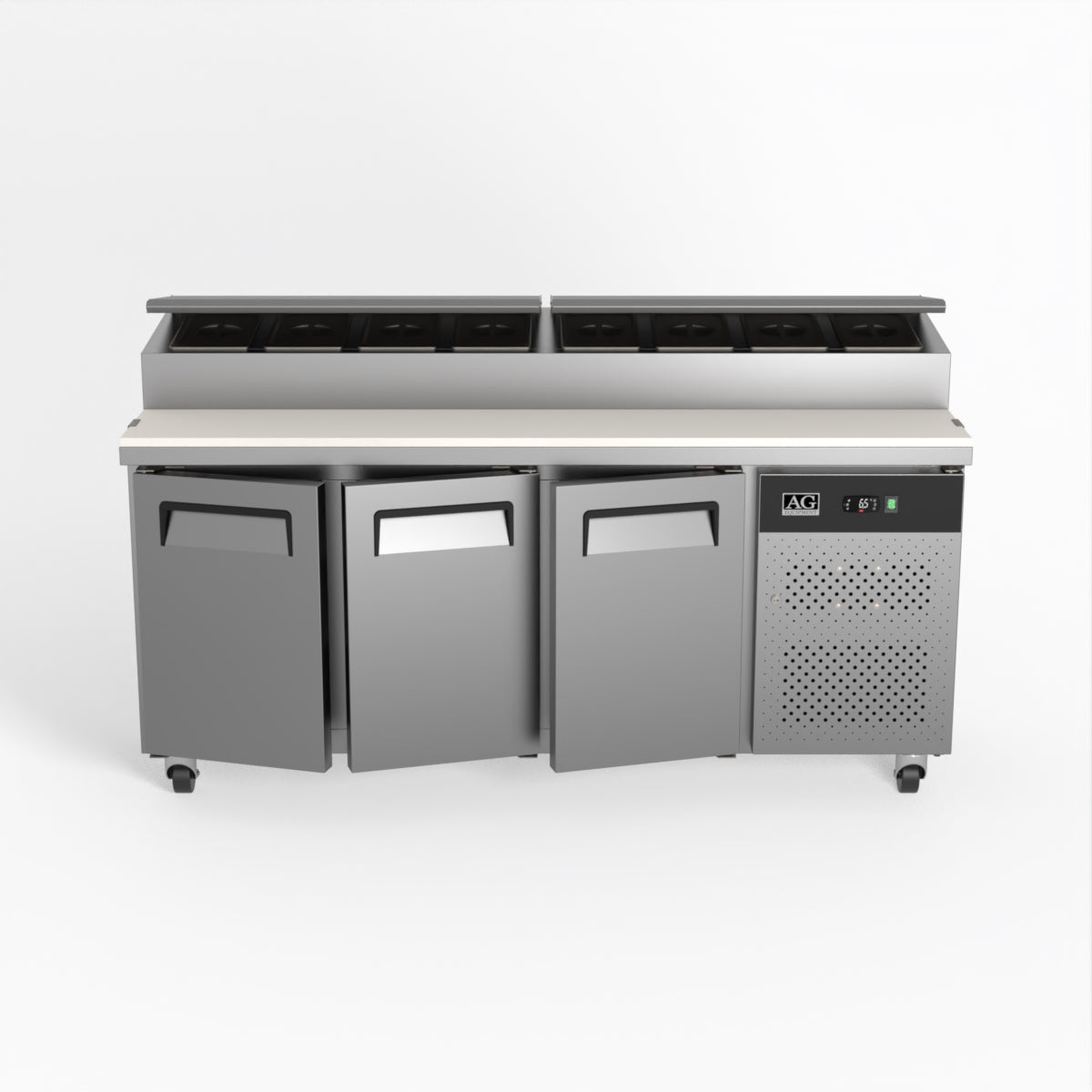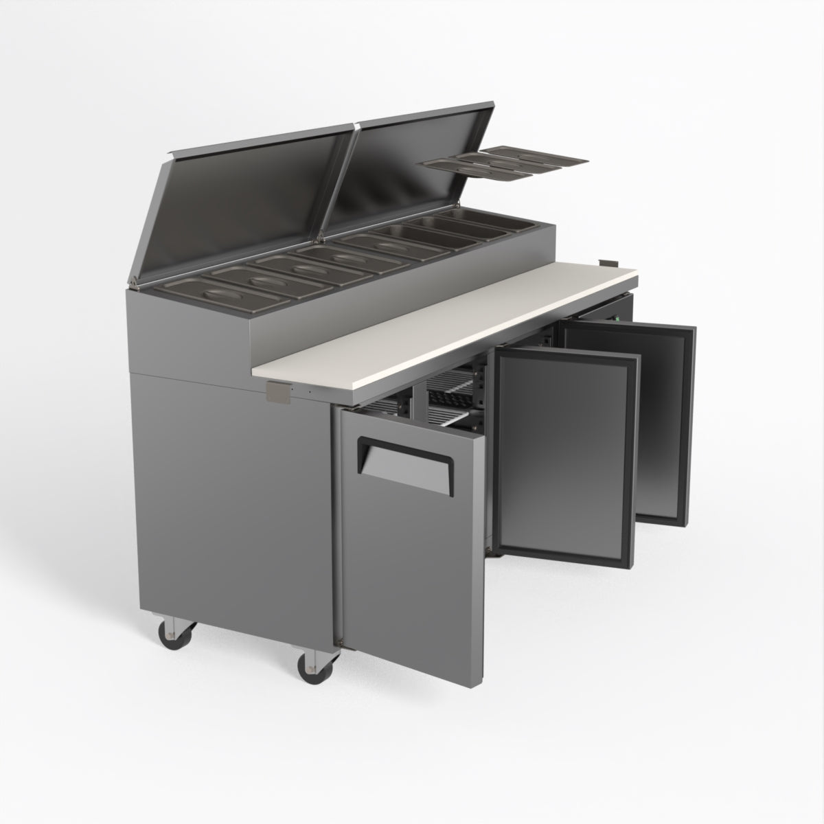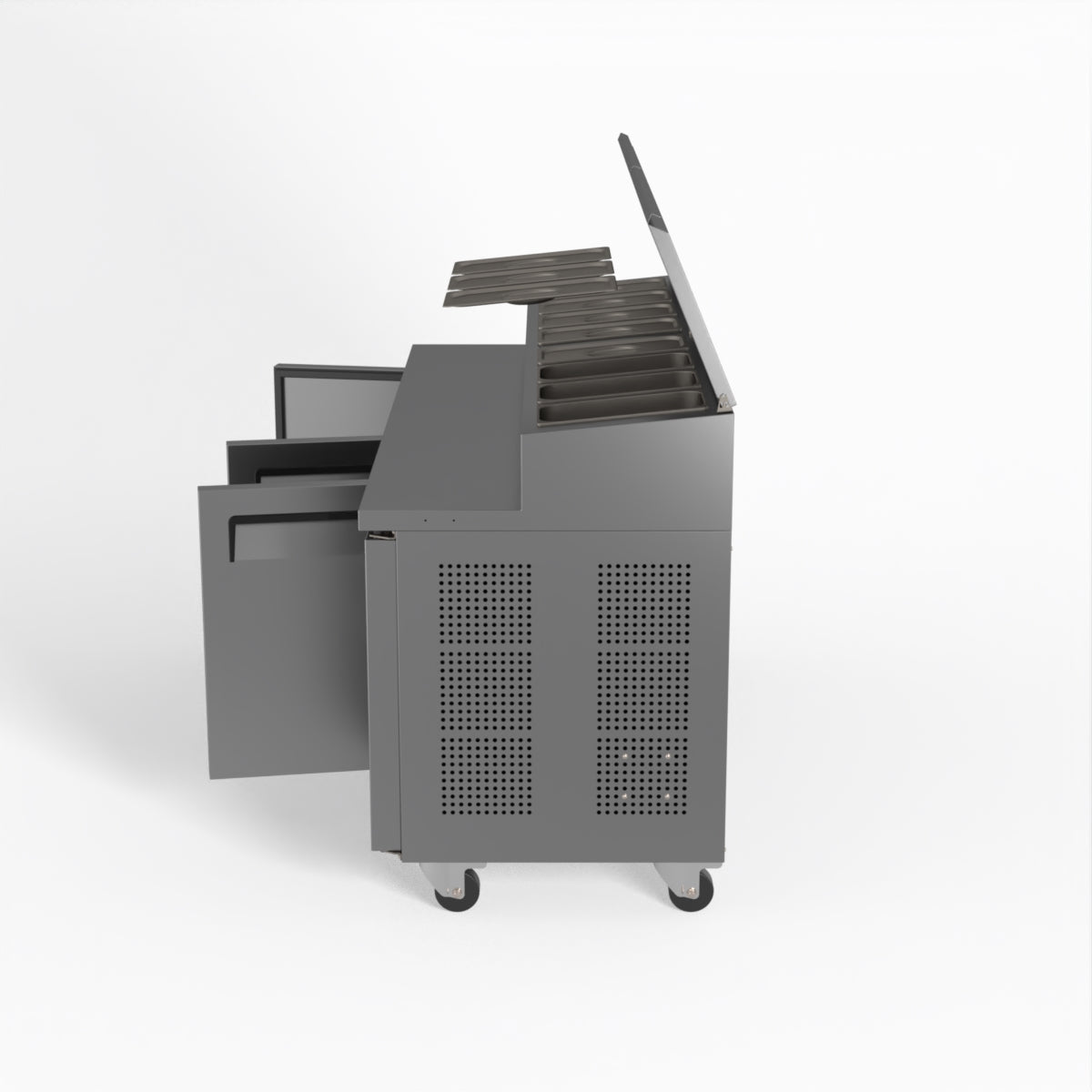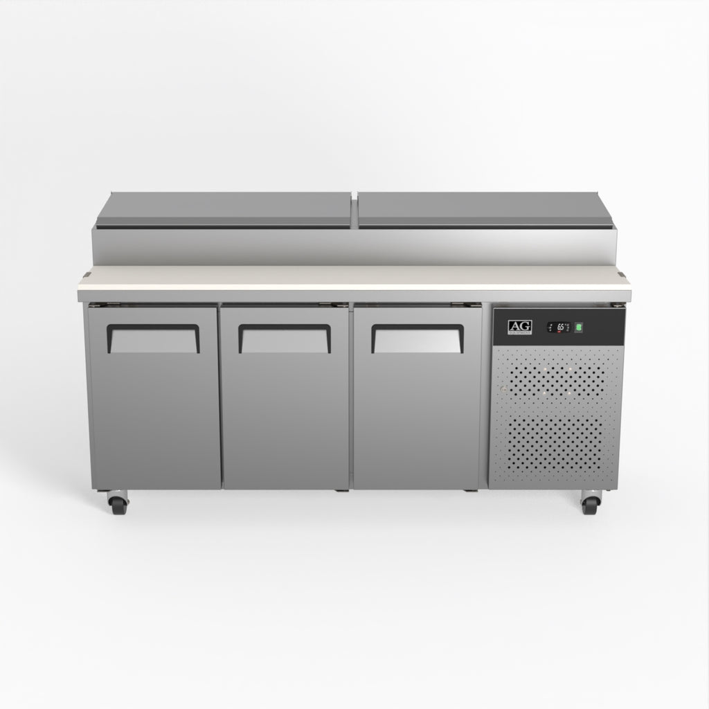 Equipped with castor wheels for easy manoeuvrability and constructed from heavy-duty stainless steel, the saladette worktop fridge is designed for busy commercial environments such as cafes, restaurants, pubs, and sandwich shops. With a 30cm deep preparation bench, self-closing doors on the fridge storage space and shelving rails suitable for 1/1 GN and 1/3 GN trays, this unit is designed to keep food products fresh and accessible during the meal-time rush. This unit is built with a Cubigel compressor and an automated defrosting system, complemented by Carel iJF digital controller with LED temperature displays.