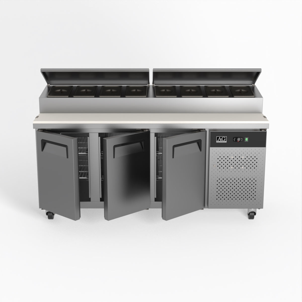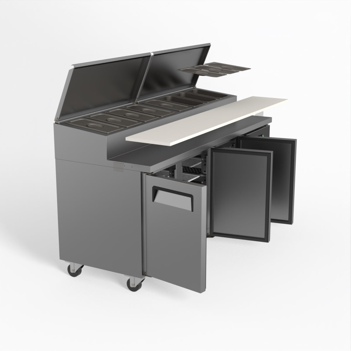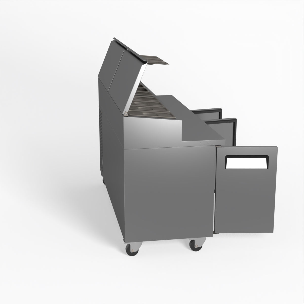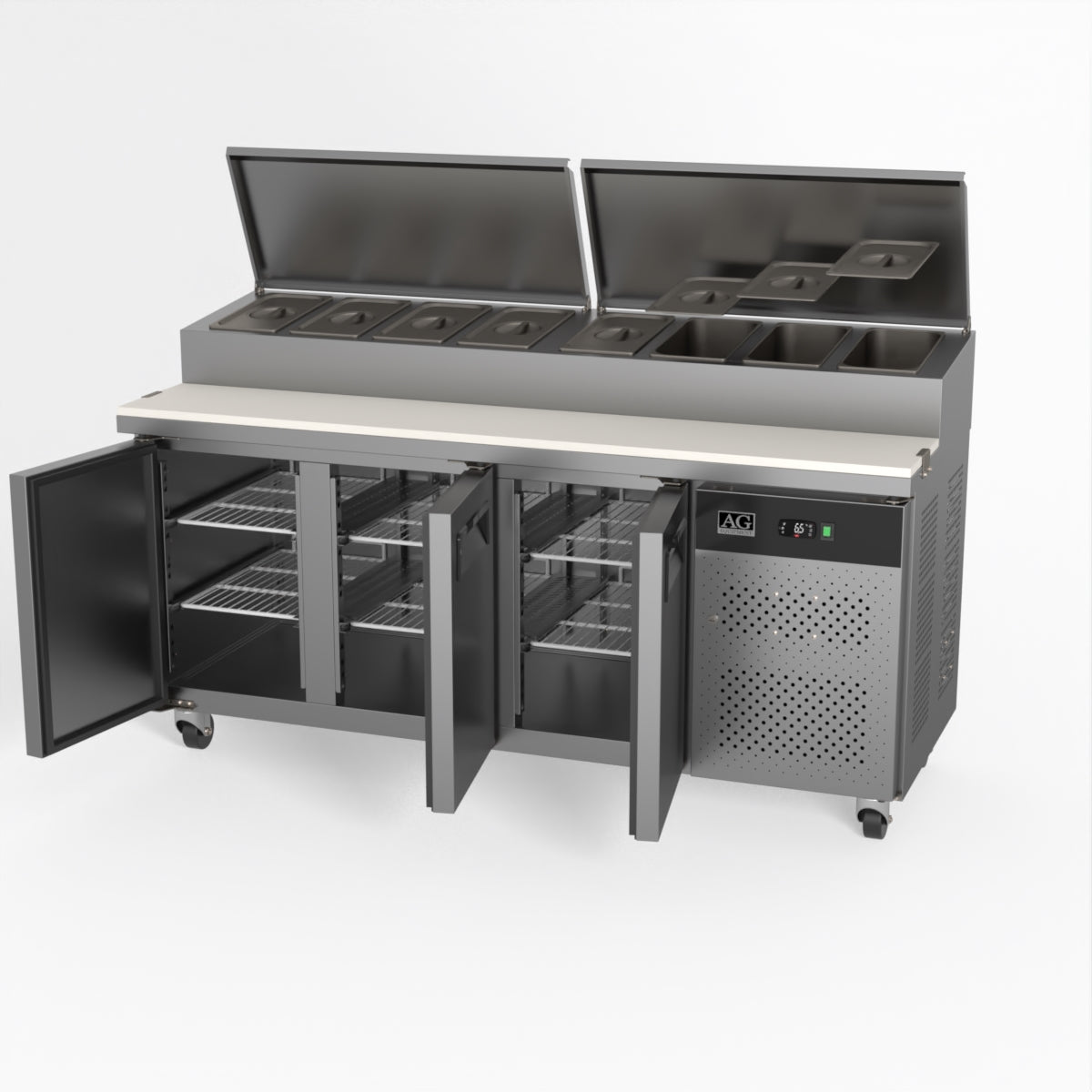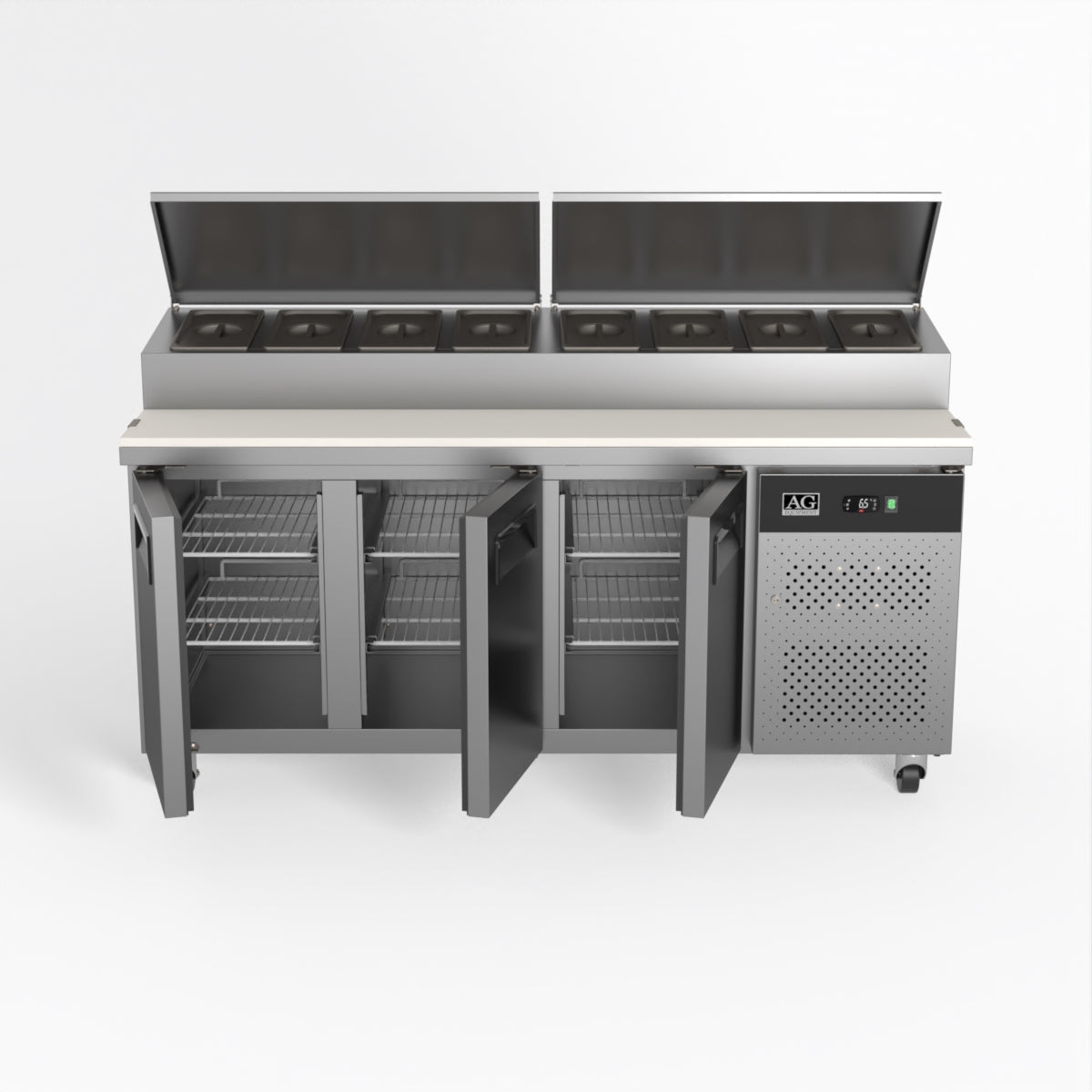 Equipped with castor wheels for easy manoeuvrability and constructed from heavy-duty stainless steel, the saladette worktop fridge is designed for busy commercial environments such as cafes, restaurants, pubs, and sandwich shops. With a 30cm deep preparation bench, self-closing doors on the fridge storage space and shelving rails suitable for 1/1 GN and 1/3 GN trays, this unit is designed to keep food products fresh and accessible during the meal-time rush. This unit is built with a Cubigel compressor and an automated defrosting system, complemented by Carel iJF digital controller with LED temperature displays.
