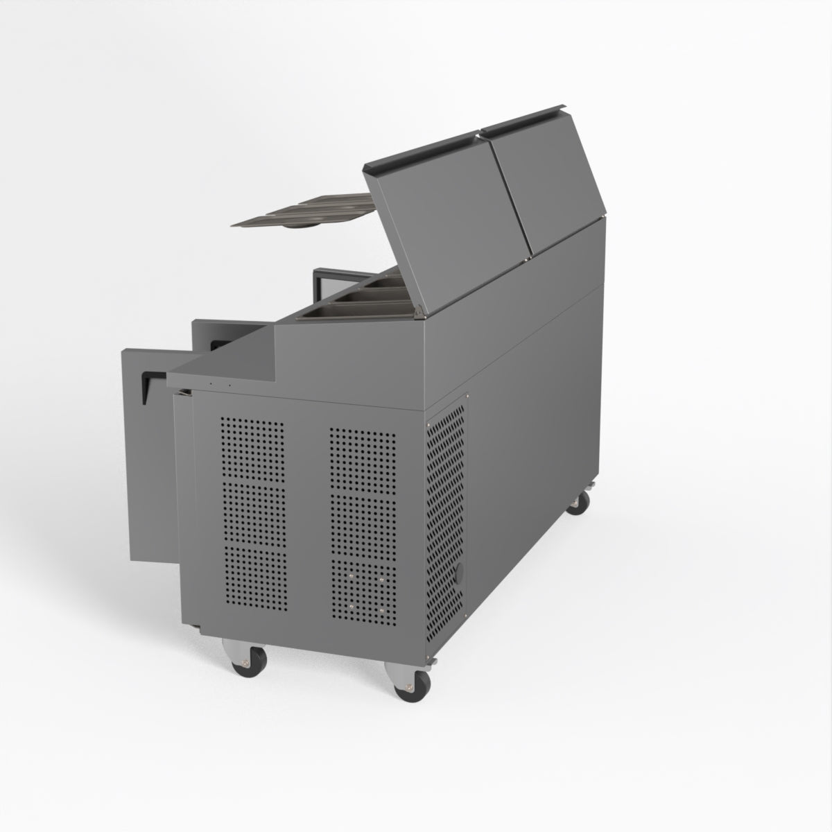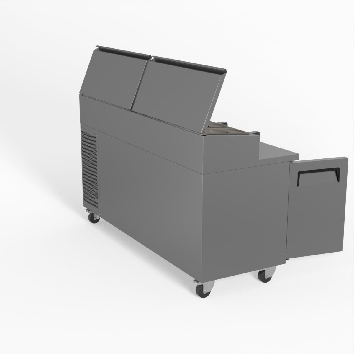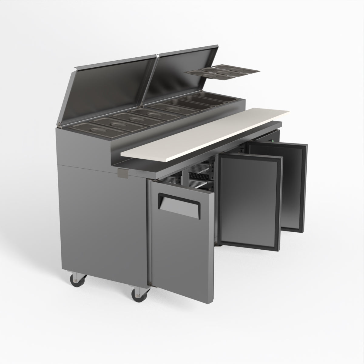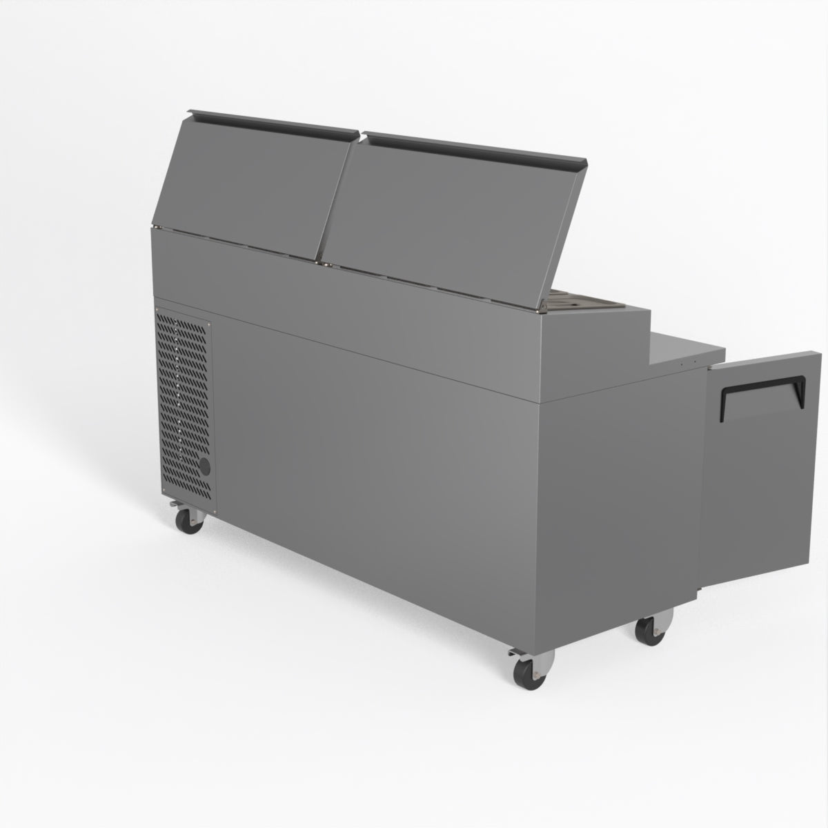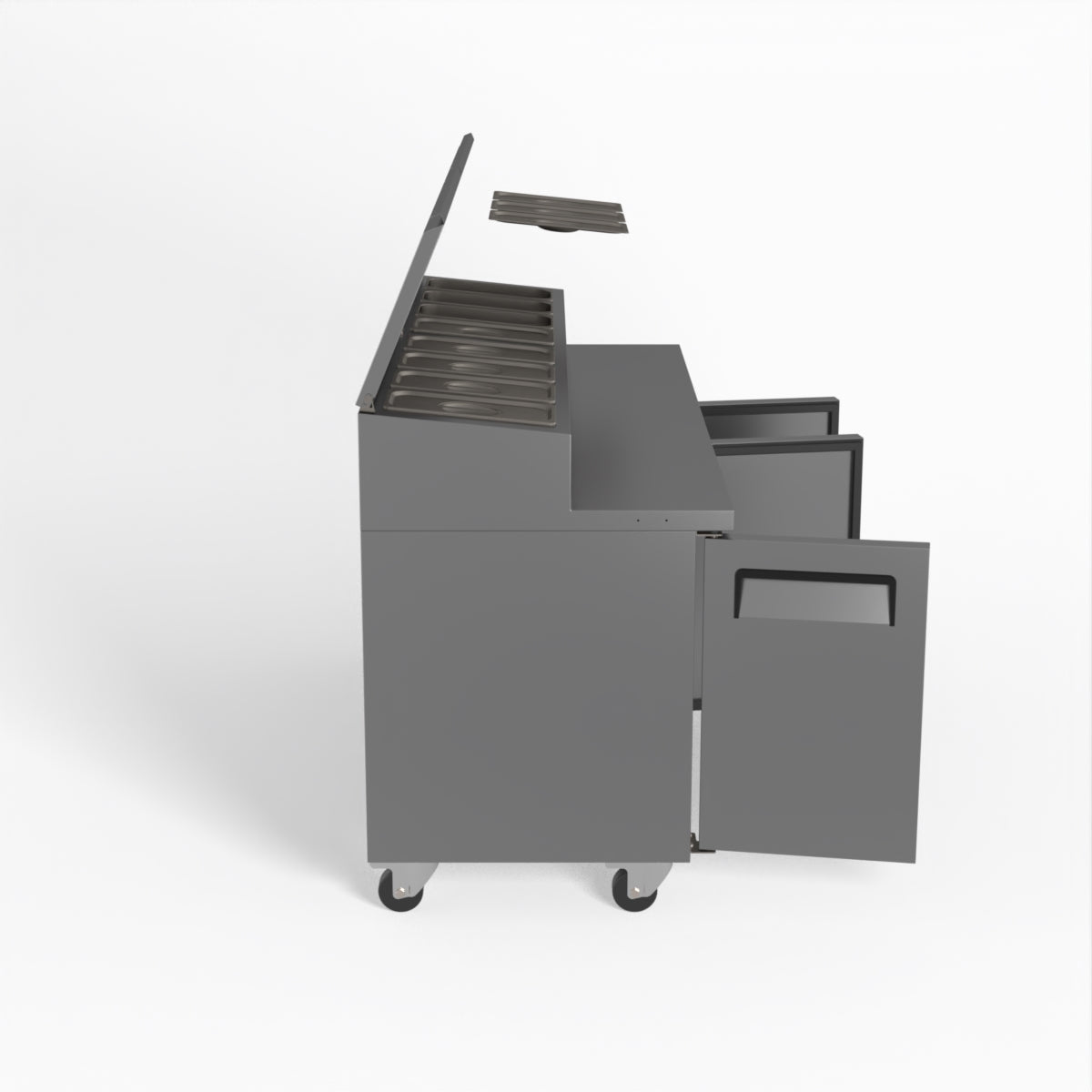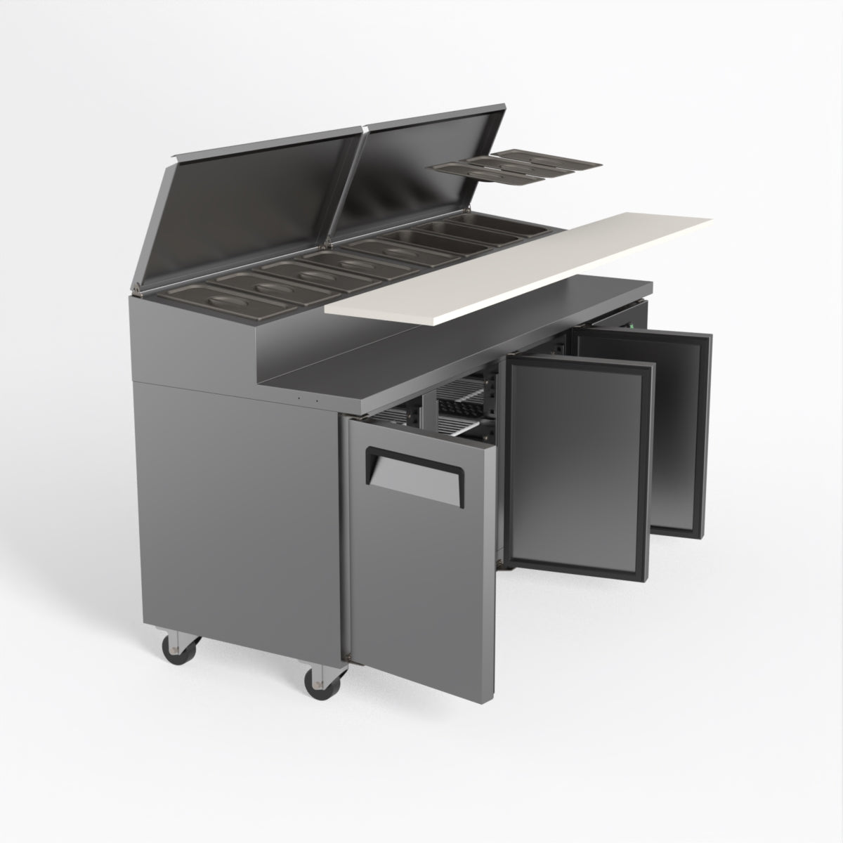Equipped with castor wheels for easy manoeuvrability and constructed from heavy-duty stainless steel, the saladette worktop fridge is designed for busy commercial environments such as cafes, restaurants, pubs, and sandwich shops. With a 30cm deep preparation bench, self-closing doors on the fridge storage space and shelving rails suitable for 1/1 GN and 1/3 GN trays, this unit is designed to keep food products fresh and accessible during the meal-time rush. This unit is built with a Cubigel compressor and an automated defrosting system, complemented by Carel iJF digital controller with LED temperature displays.