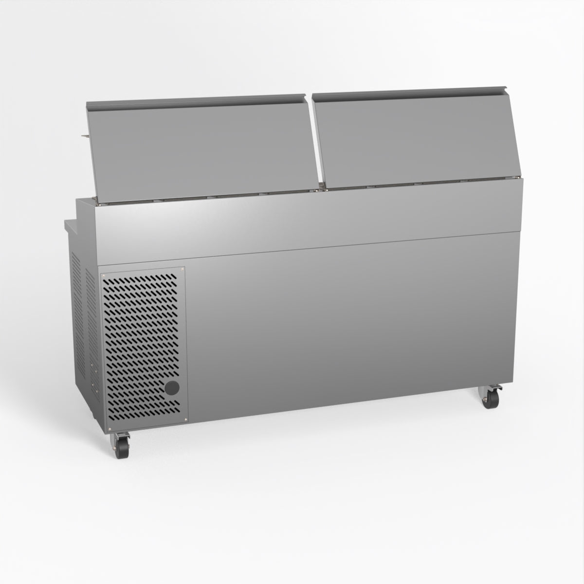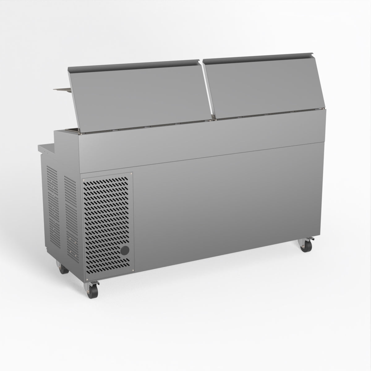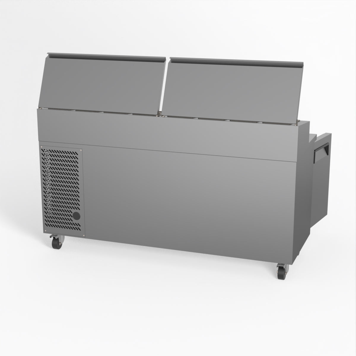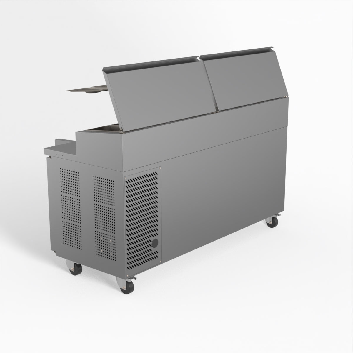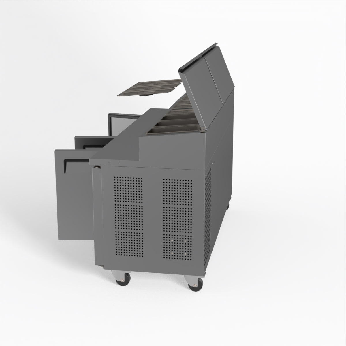 Equipped with castor wheels for easy manoeuvrability and constructed from heavy-duty stainless steel, the saladette worktop fridge is designed for busy commercial environments such as cafes, restaurants, pubs, and sandwich shops. With a 30cm deep preparation bench, self-closing doors on the fridge storage space and shelving rails suitable for 1/1 GN and 1/3 GN trays, this unit is designed to keep food products fresh and accessible during the meal-time rush. This unit is built with a Cubigel compressor and an automated defrosting system, complemented by Carel iJF digital controller with LED temperature displays.