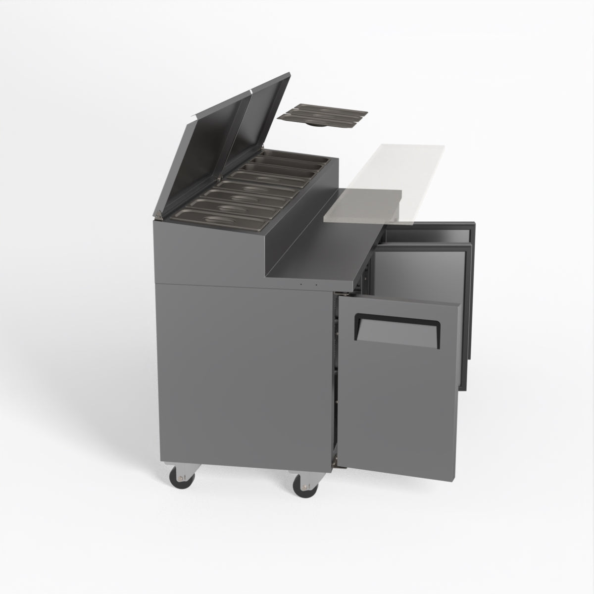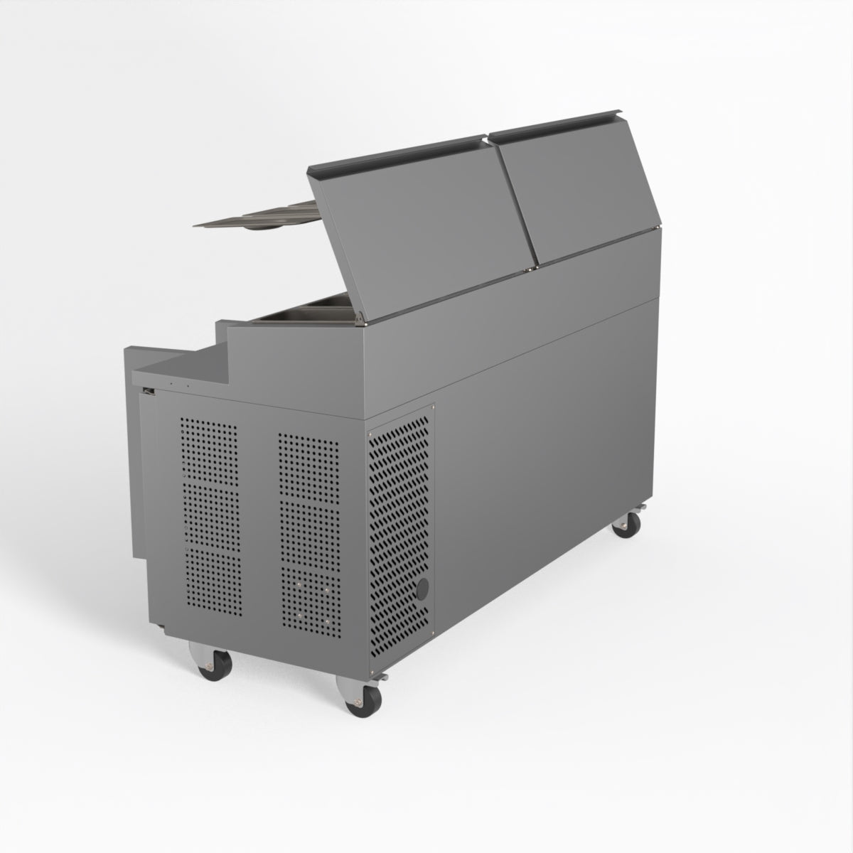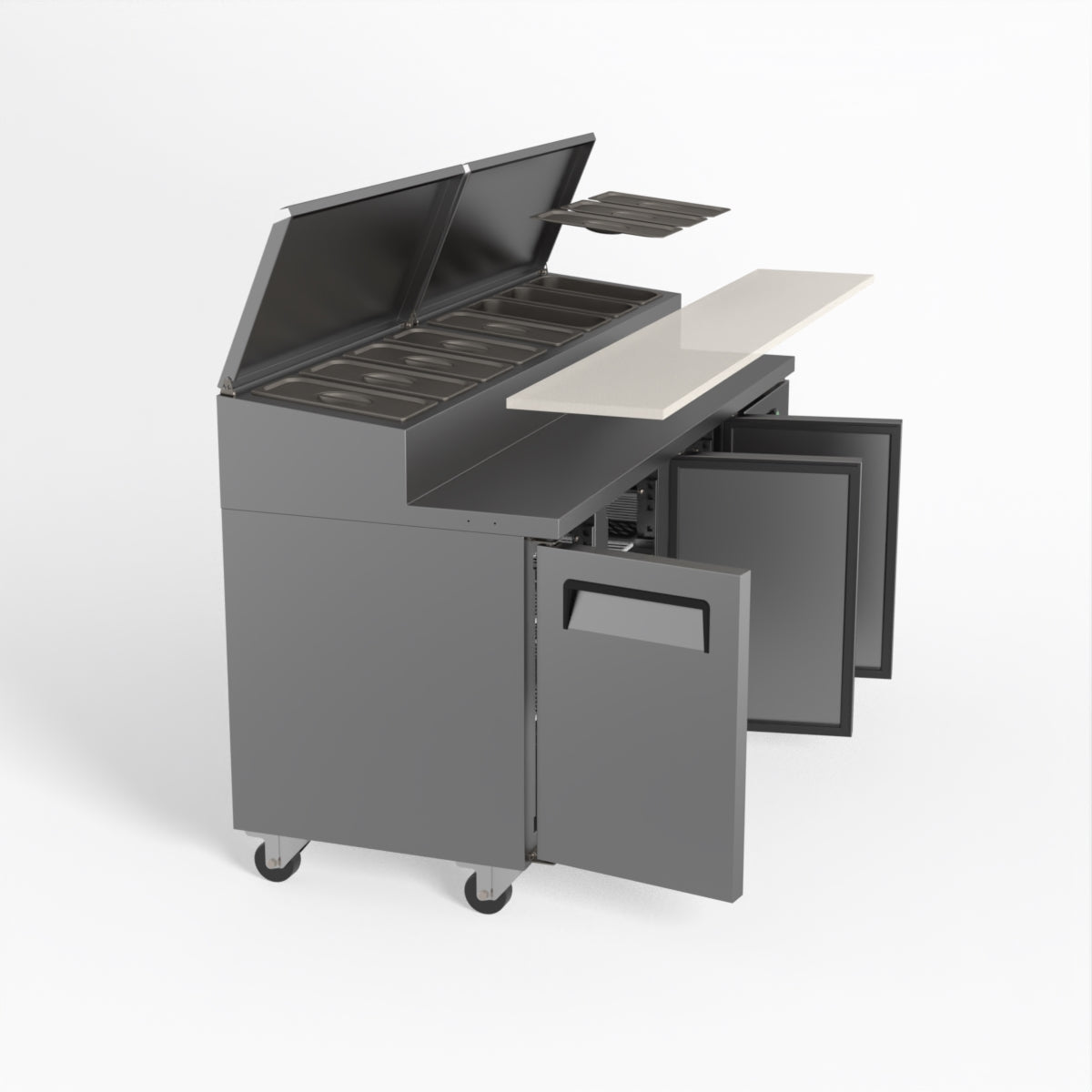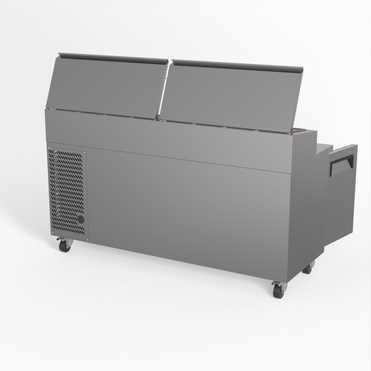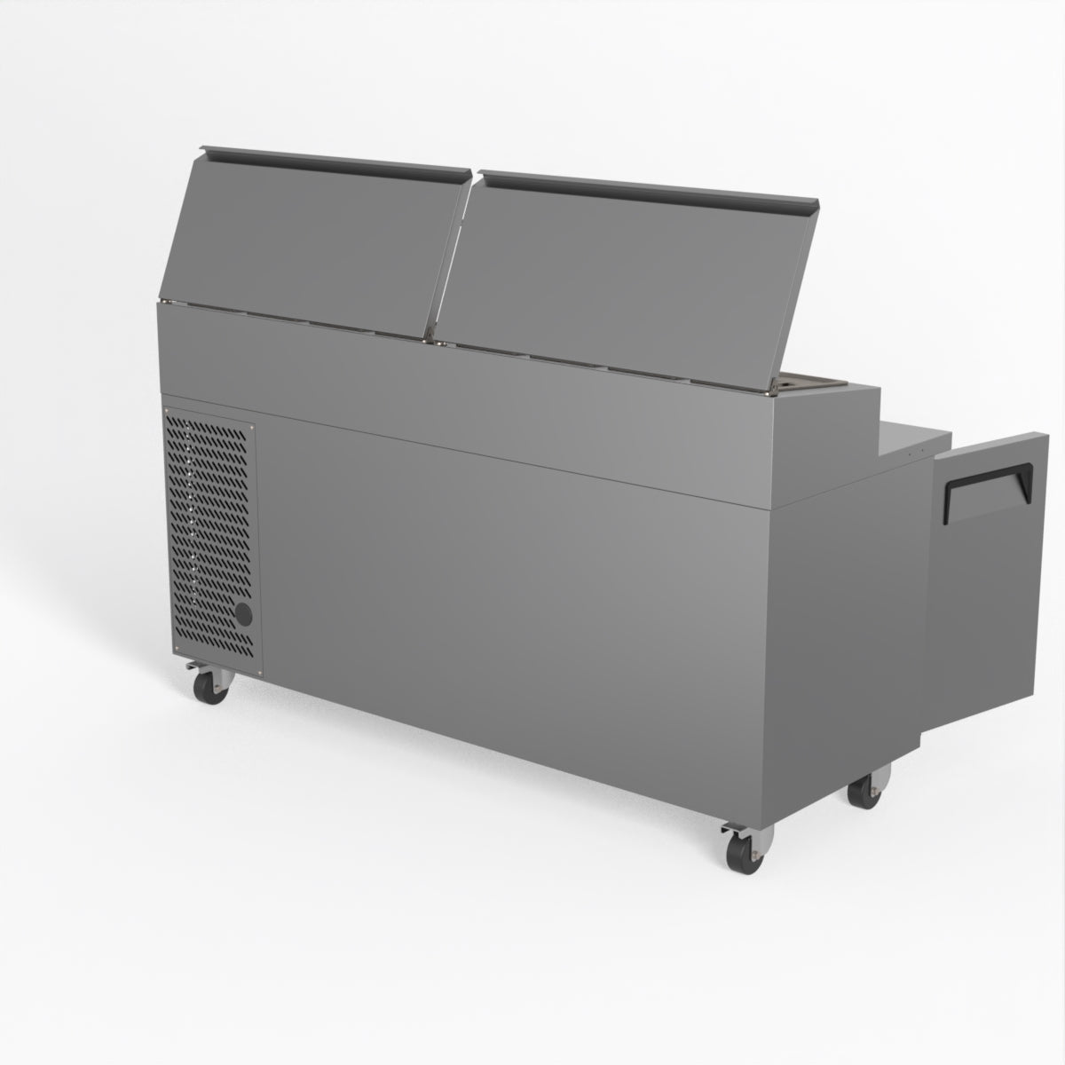 Equipped with castor wheels for easy manoeuvrability and constructed from heavy-duty stainless steel, the saladette worktop fridge is designed for busy commercial environments such as cafes, restaurants, pubs, and sandwich shops. With a 30cm deep preparation bench, self-closing doors on the fridge storage space and shelving rails suitable for 1/1 GN and 1/3 GN trays, this unit is designed to keep food products fresh and accessible during the meal-time rush. This unit is built with a Cubigel compressor and an automated defrosting system, complemented by Carel iJF digital controller with LED temperature displays.